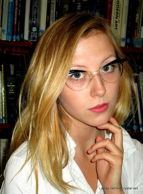 Fine posing by Bonnie in black half rim cat eye glasses. The frame has been popular among models ever since the start of my project. The glasses were featured in my early photo shoots in 2009 (Irma 013) and 2010 (Rachel 004, Hiska 065) on my first weblog. They were also used during the catwalk at the opening of my first exhibition with "Ladies behind crystal veil" in 2010 (see You Tube Lentilux).